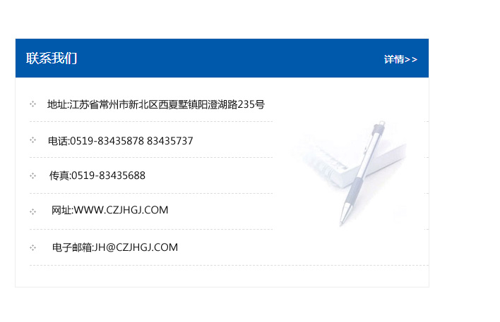 傳真:0519-83435688    郵編:213135    網址:WWW.czjhgj_com.midwul.com    電子郵箱:JH@czjhgj_com.midwul.com